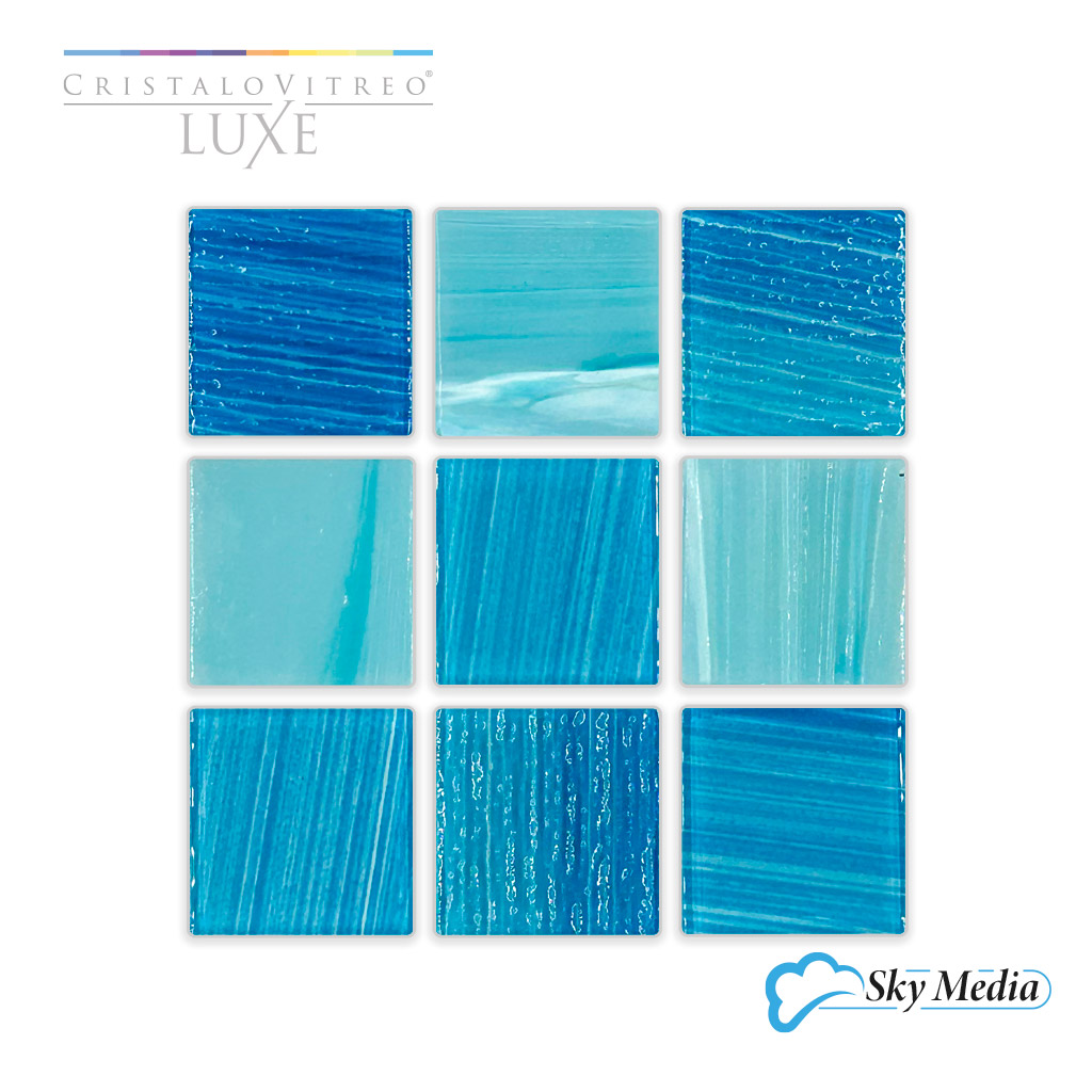 La mezcla de mosaicos Sky Media de Cristalo Vitreo LUXE es una combinación única de azules profundos que evocan el poder y la serenidad del cielo en su máximo esplendor. Con piezas de 3.5 x 3.5 cm, cada mosaico está diseñado para destacar y dar un toque sofisticado y refinado a cualquier ambiente.